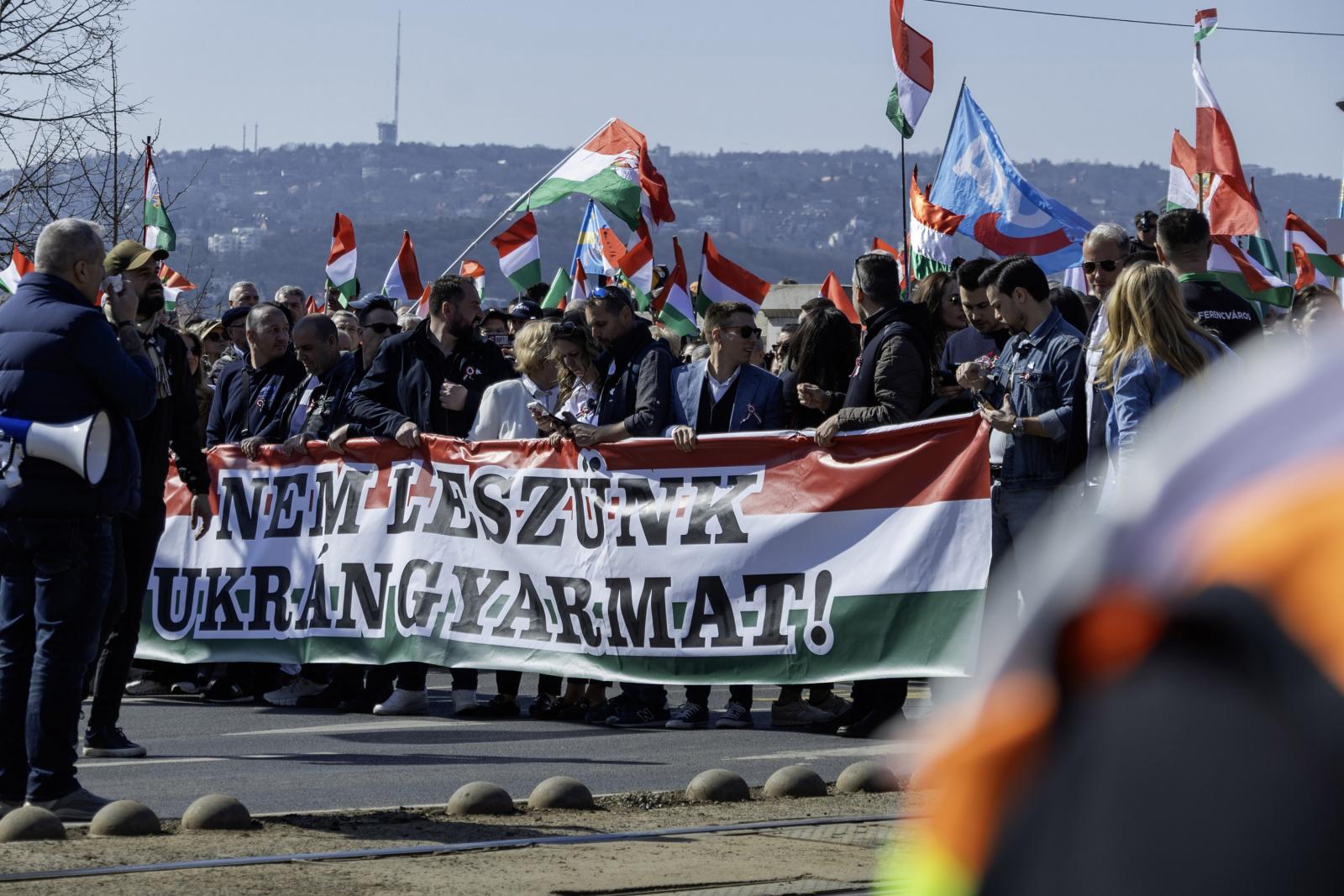 „Nem leszünk ukrán gyarmat!” – ezzel a mottóval vonult fel az ismét megrendezett kormánypárti Békemenet. Mintha majdnem fél évet visszarepültünk volna az időben. Ahogyan tavaly október 23-án, most március 15-én is végeláthatatlan sorban hozták a buszok az embereket a Margit híd budai hídfőjéhez. A gyülekezőhelyen – DK-sok aktivisták jóvoltából – kormányellenes feliratok várták az érkezőket, akik azonban inkább a Fidesz és Orbán Viktor éltetésével voltak elfoglalva.