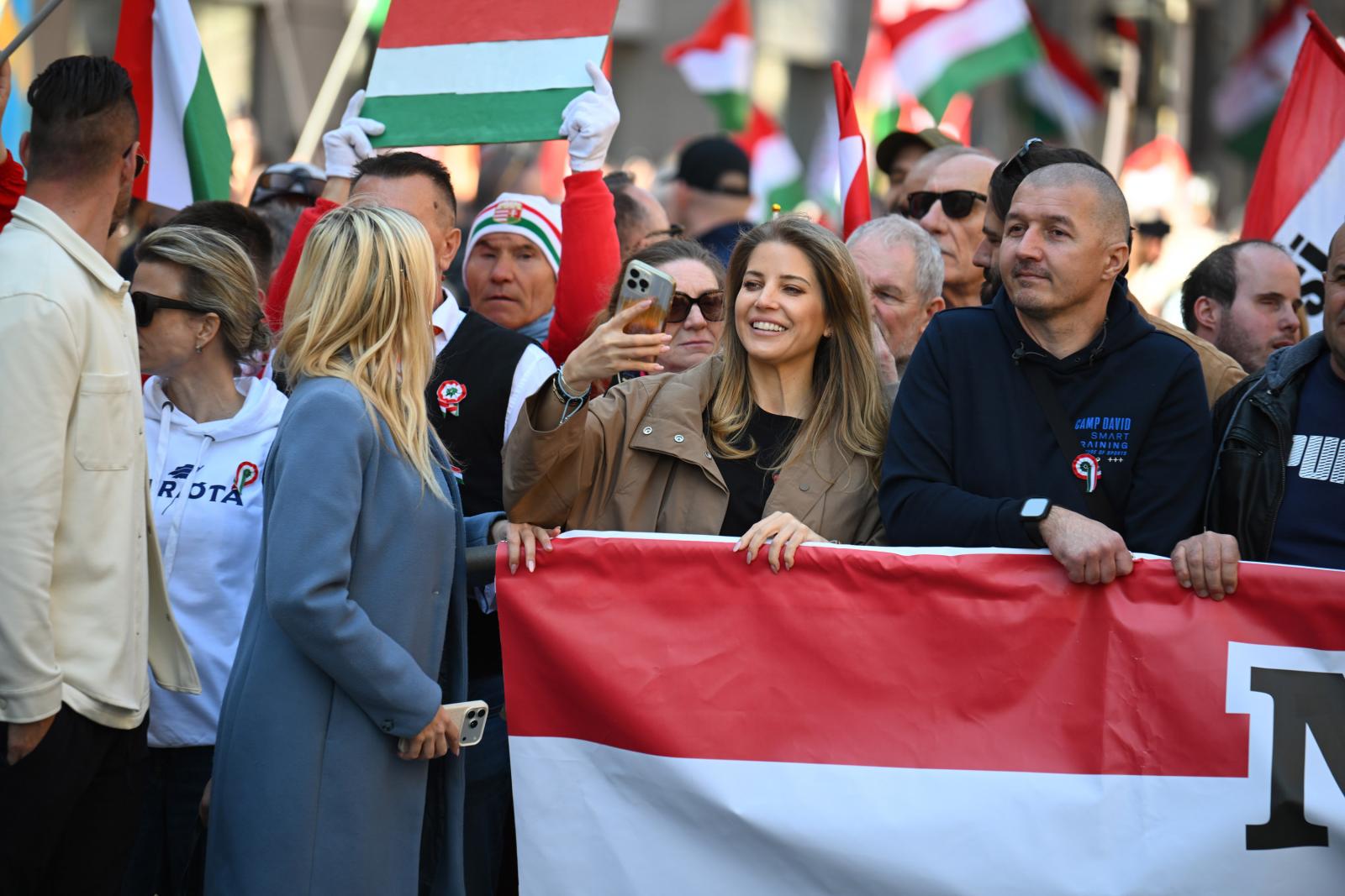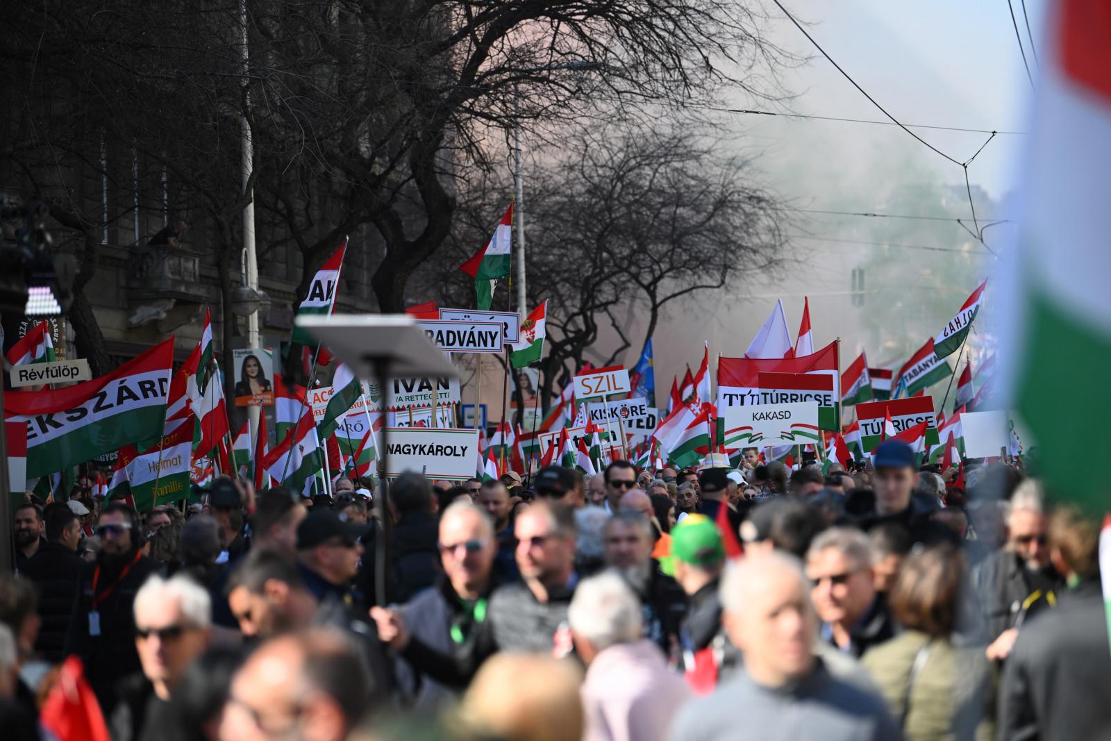 A tömeg – jó néhány tízezren lehettek – vidámnak és lelkesnek tűnt. A szervezők többféle táblát osztogattak. Az egyik azt hirdette, hogy „Zelenszkij rabjai nem leszünk!”, a másik azt, hogy „A Fidesz a biztos választás”. A harmadikon Magyar Péter és Volodimir Zelenszkij áthúzott fényképe mellett az állt, hogy „Stop háború!”, a negyediken szintén áthúzva cirill betűkkel és ukrán nemzeti színekkel szerepelt a Tisza.