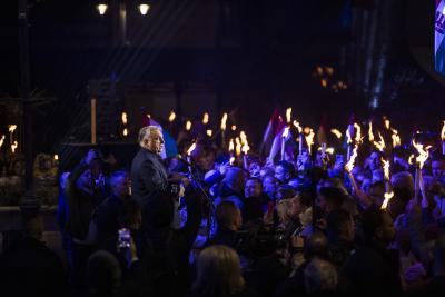 A hivatalos program Takáts Tamással vette kezdetét, aki a Karthágó régi slágerét, az Apáink útjánt énekelte el a tömegnek, mely a kezdésre azért körülbelül kétezer fő fölé nőtt. A dal után Szita Károly következett, aki felmondta a hivatalos Fidesz-narratíva főbb pontjait a háborúról, a Brüsszel és Ukrajna által fizetett Magyar Péterről és Tisza Pártról – a hallgatóság egy része bőszen fütyölt és pfújolt –, soha nem látott tömegnek nevezte az egybegyűlteket, s meggyújttatta velük a kiosztott fáklyákat. Ami nem mindenkinek ment könnyen, s több idősebb fideszes éppen a tiszás fiatalok segítségét kérte, akik készségesen adták tovább a lángot… Szita a beszéde végén a választás tétjeként azt határozta meg, hogy Orbán Viktor vagy Zelenszkij alakít-e majd kormányt, s az ukránokkal kapcsolatban megjegyezte, példátlan, hogy személyében fenyegették meg a magyar kormányfőt és családját.