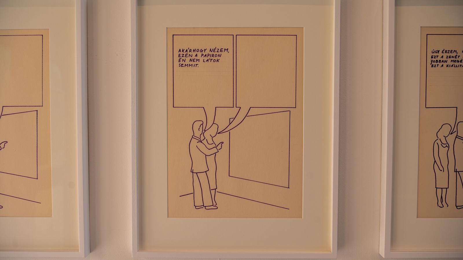 – A rajzsorozat az úgynevezett frusztrációs teszten alapszik, melyet 1945-ben Saul Rosenzweig amerikai pszichológus hozott létre, és amelyet máig is használnak a pszichológiában. Ennek lényege, hogy az alany egy frusztráló helyzetet ábrázoló rajzot néz, melyben látja az egyik szereplő mondandóját egy szövegbuborékban, a másikét azonban nem, így az alanynak kell azt spontán módon kitöltenie – mondta lapunknak a kiállítás kurátora, Zemlényi-Kovács Barnabás, hozzátéve, Birkás Ákos Katasztrófa-helyzetek című sorozata is erre a képi logikára épül, és a kortárs művészettel való találkozást is frusztráló szituációként mutatja meg.