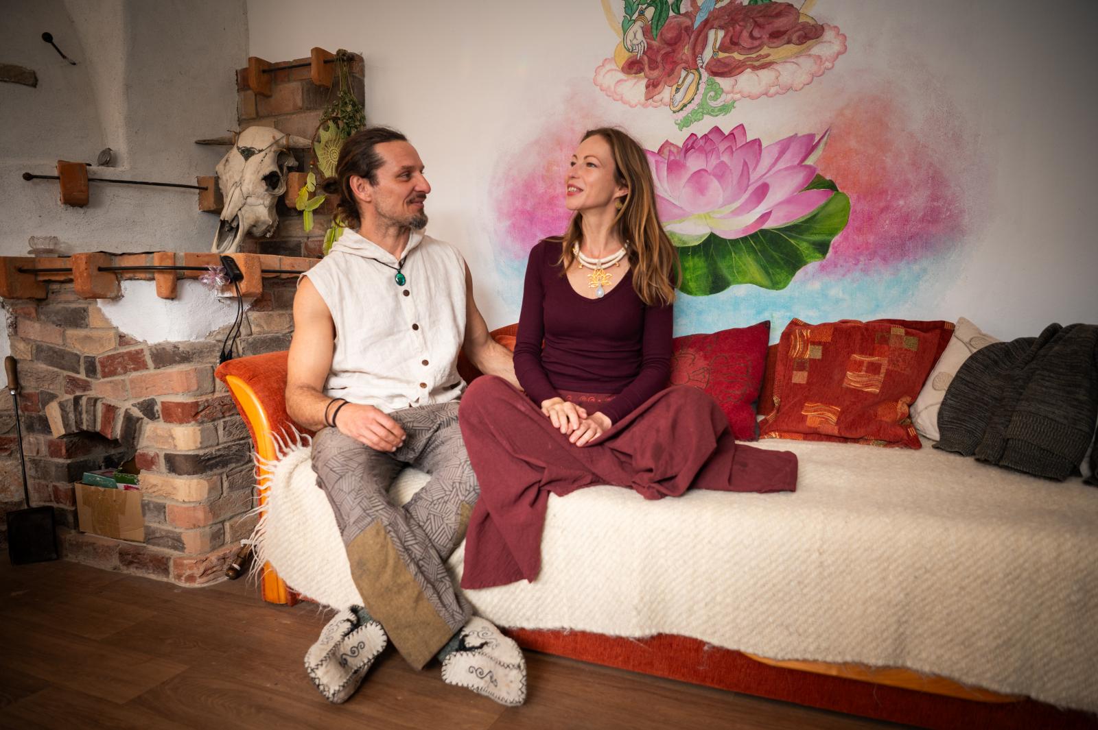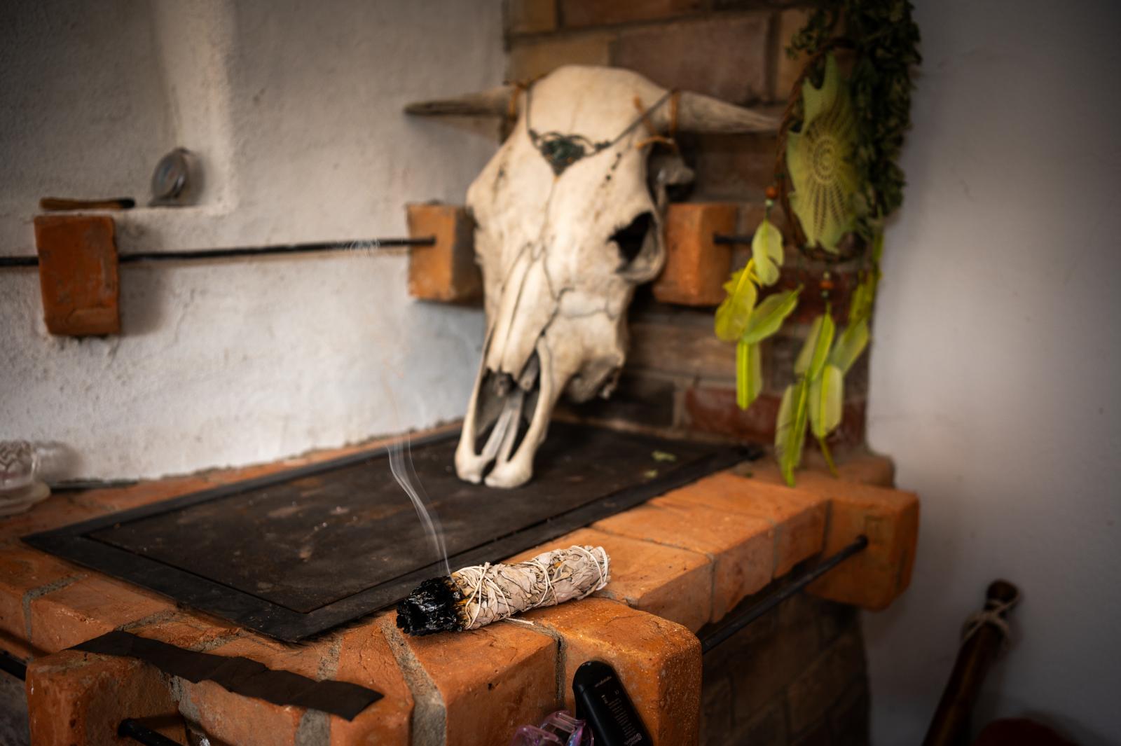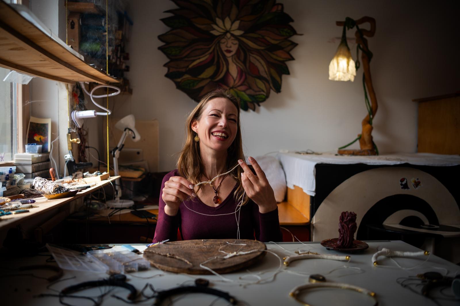 Mihály Cecília műhelyében is számos természeti kincs akad: a jávorszarvas-koponyát például párja, Tibor hozta Svédországból, amikor tűzzsonglőrként beutazta a világot. Lekuporodunk az emelt kis sarokba, a kemence mellé. Körülöttünk madártollak, virágok, kristályok, és az ihletet adó tündérek.