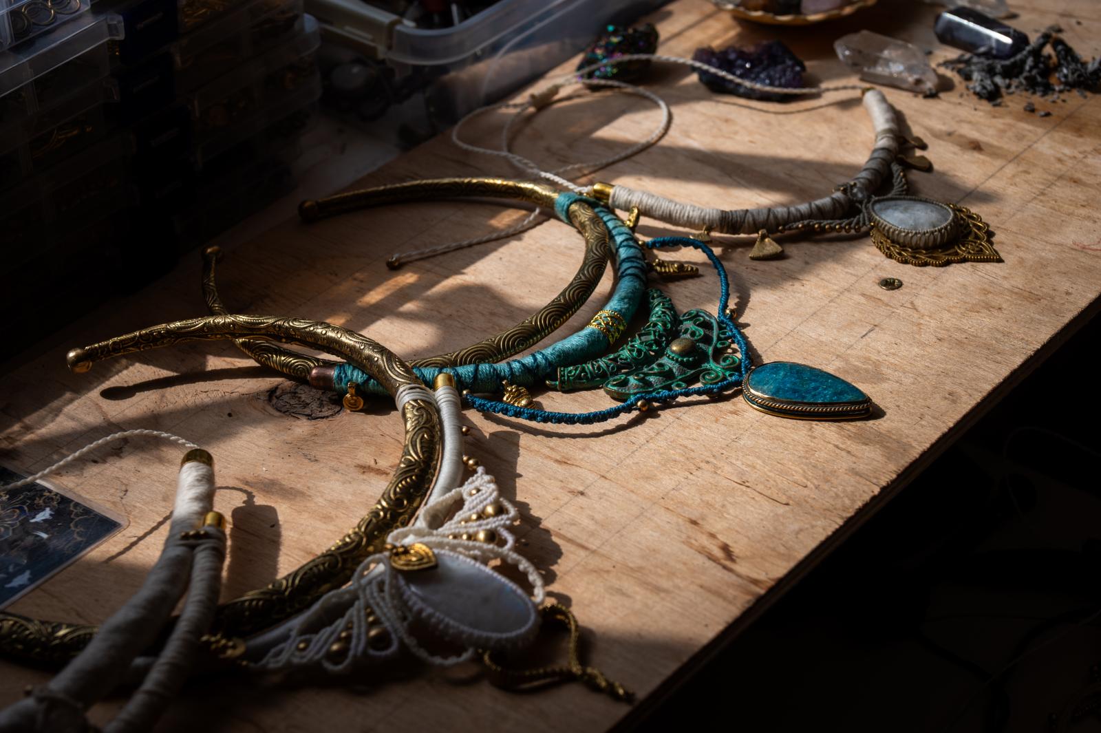 Cecília az ékszerekhez nem használ üveget, csakis bronzot, rezet és féldrágaköveket. Végig is mutatja nekünk gyűjteményét: van itt achát, holdkő, rózsakvarc, kianit, apatit, aurakvarc, rutilkvarc, rubin, fekete obszidián, zöld gránát, azurit és pávaszem kagyló is. Míg ő a kőtípust választja ki, az egyes kövek saját energiáját már a viselő érzi meg. Segít ráhangolódni, de ezután hagyja, hadd szólítsa meg őket a kő. A legutóbbi vásáron odament hozzá egy anyuka a gyermekével, akinek volt egy komolyabb kibillenése, amivel már orvosnál, pszichológusnál is jártak. Ahogy Cili fogalmaz, valami nagyon elfújta őt a lelkéből, és kellett egy kő, ami visszaerősíti.