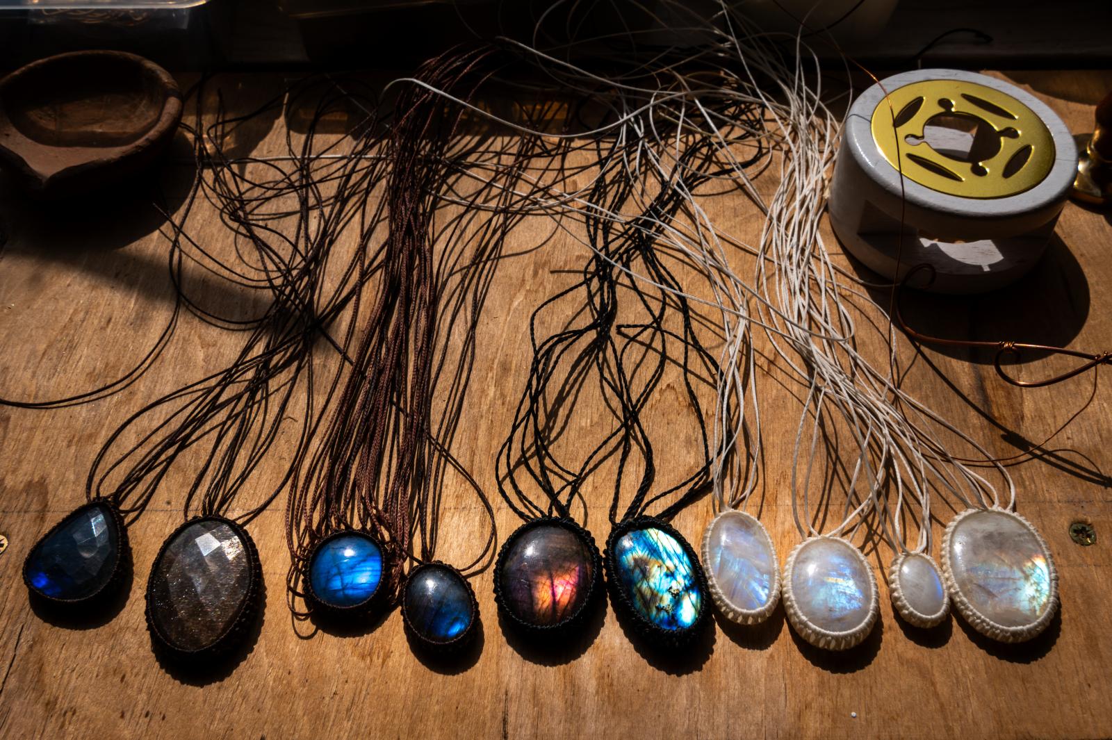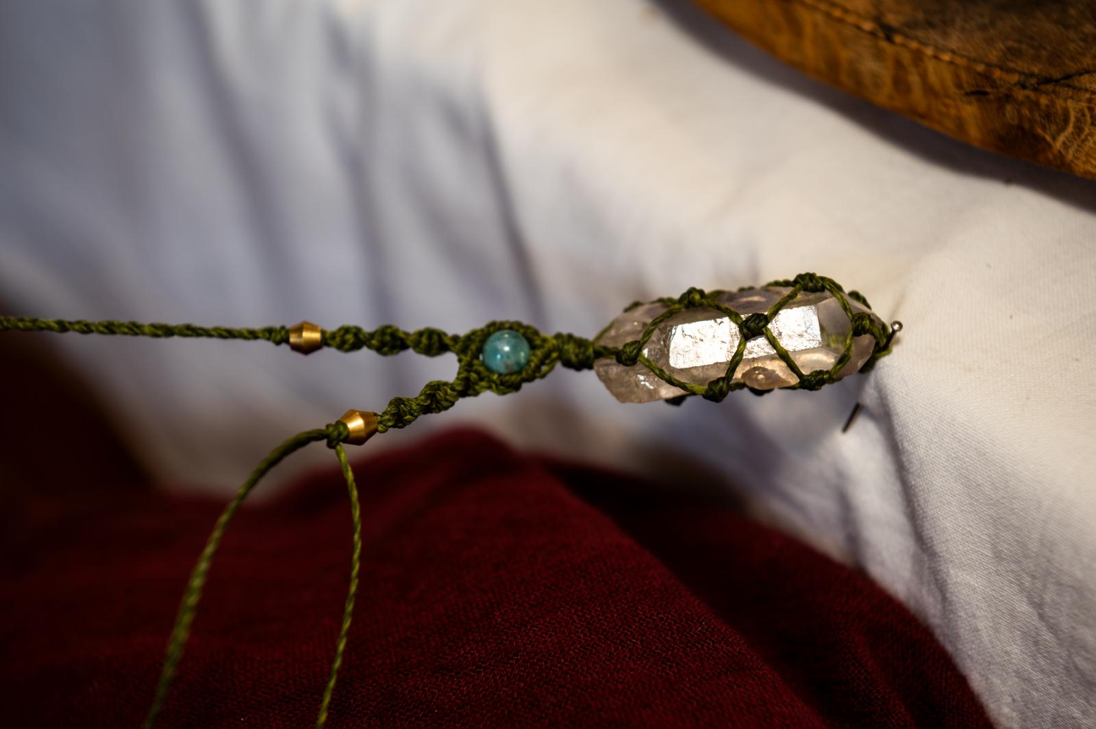 – Jobb szeretek törökülésben ülve dolgozni – kezdi házigazdánk, akinek a zsálya illatos füstje tölti be műhelyét. – A kristályokat a legjobb indiai kőcsiszolóktól veszem. Régen sokat utaztam, elmentem hozzájuk is, azóta tőlük rendelek. Ezt a nyakéket tegnap este készítettem, rendrakás közben – mutatja a ragyogó opálból készült, kecses alkotást. – Közben csinálok egy nyakláncot, válassz színt és egy követ! – mondja fotósunknak, majd nekilát mohazöld fonallal körbecsomózni a hegyikristályt. Az egyszerűbb nyakláncait férfiak is hordhatják, Tibor is megmutatja nekünk, amit Cecília workshopján magának készített.