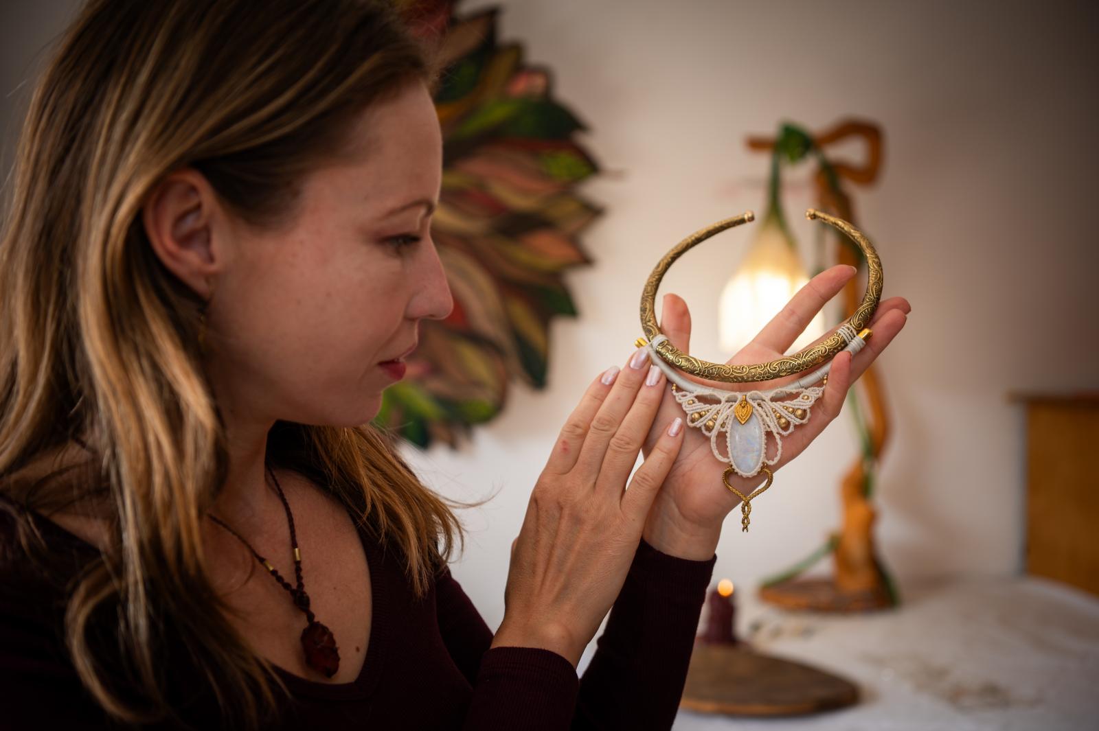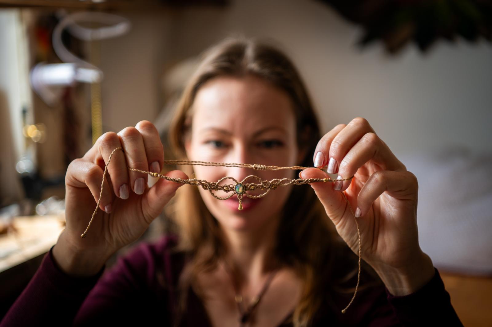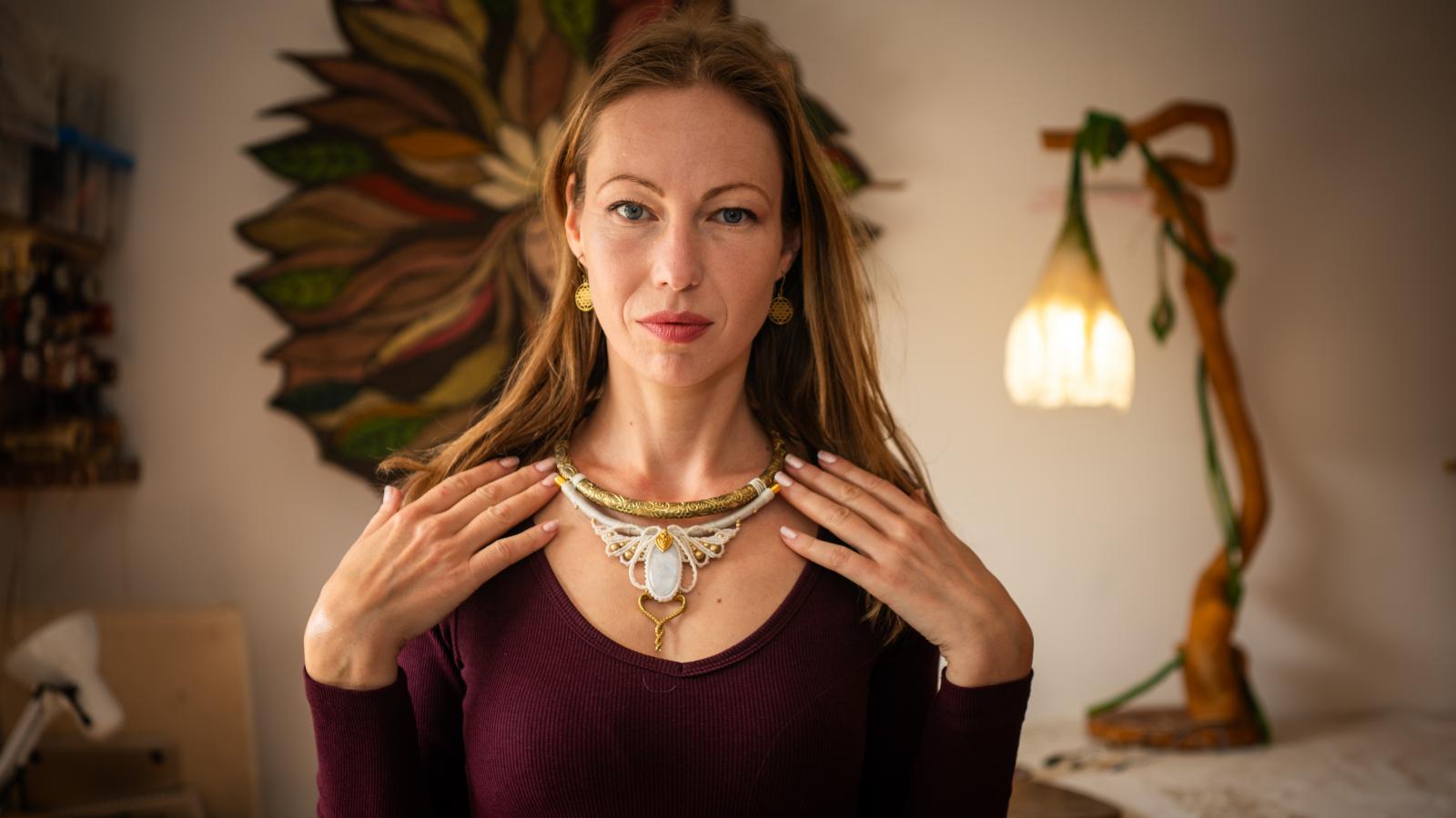 Minden egyes ékszerben, amit készít – még ha nem is tudja, kié lesz –, ott az erő és a harmónia. Addig-addig rakosgatja a köveket, amíg az alkotás ragyogni nem kezd, vagy ha nem megy, félreteszi, és másnap előveszi újra. Bár szeret utazni, mozogni, nem tud úgy létezni, ha nem alkot. A makramézás mobil munka, bárhová magával viheti, akár más vidékre költőző családokat látogatnak meg, akár itt, Nyimben mennek át valakihez. A szomszédban lakik Cecília volt férje az új családjával, velük is összejárnak. Sokan kérdezhetik, vajon ez hogyan működhet, szerinte nincs nagy titok, kell hozzá intelligencia és négy érett ember.