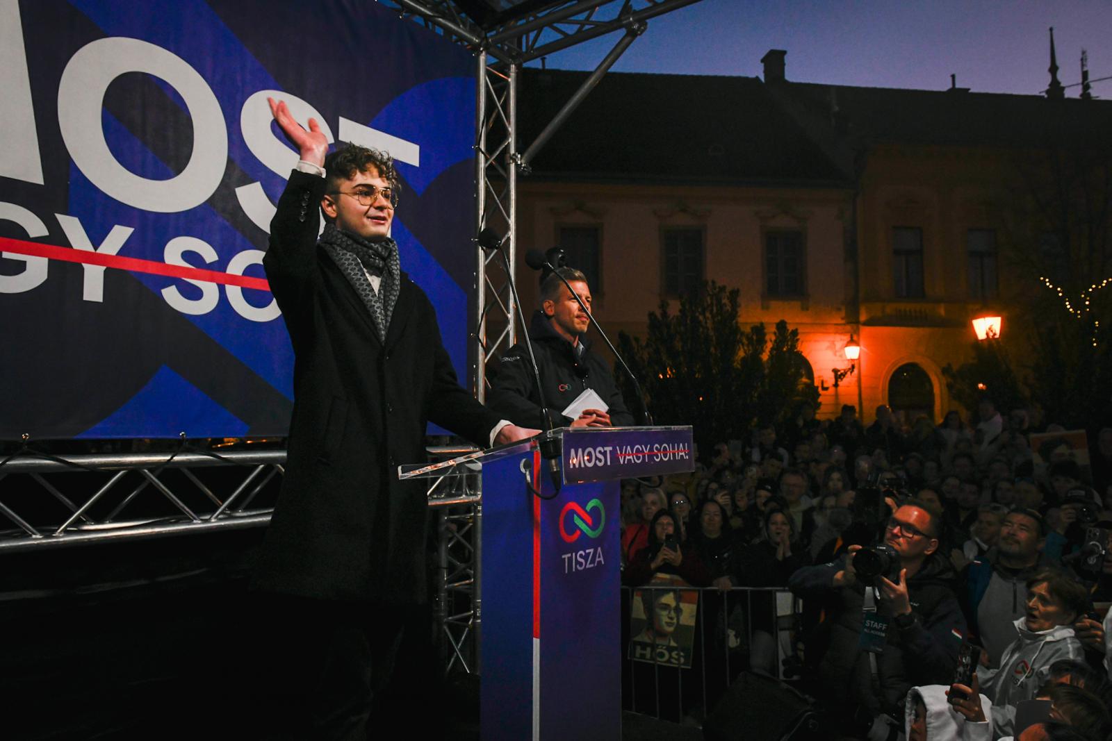 Pintér Bence feljelenti a fekete ruhásokat, akik Orbán Viktor győri rendezvényén ellentüntetőket vegzáltakFantasztikus esténk volt – búcsúzott Orbán Viktor Győrtől, a tömeg egy részén végigfutott az undorArra kérte a szimpatizánsait, hogy kerüljék a kormányfő országjárását, ne növeljék az ottani tömeget. Magyar Péter ezt követően felkonferálta Szimon Renátát, a Tisza Párt egyéni országgyűlési képviselőjelöltjét a Pest megye 11-es választókerületben. Szimon beszéde után megint színpadra lépett, és J.D. Vance amerikai alelnök látogatása alkalmából a nemzetközi közösség minden tagjának üzenve jelezte: „A magyar történelmet a magyar emberek írják, felszólítok mindenkit, tartózkodjanak attól, hogy beleszóljanak a magyar választásokba.” Az eseményen ezután röviden ismertette a Tisza programját.