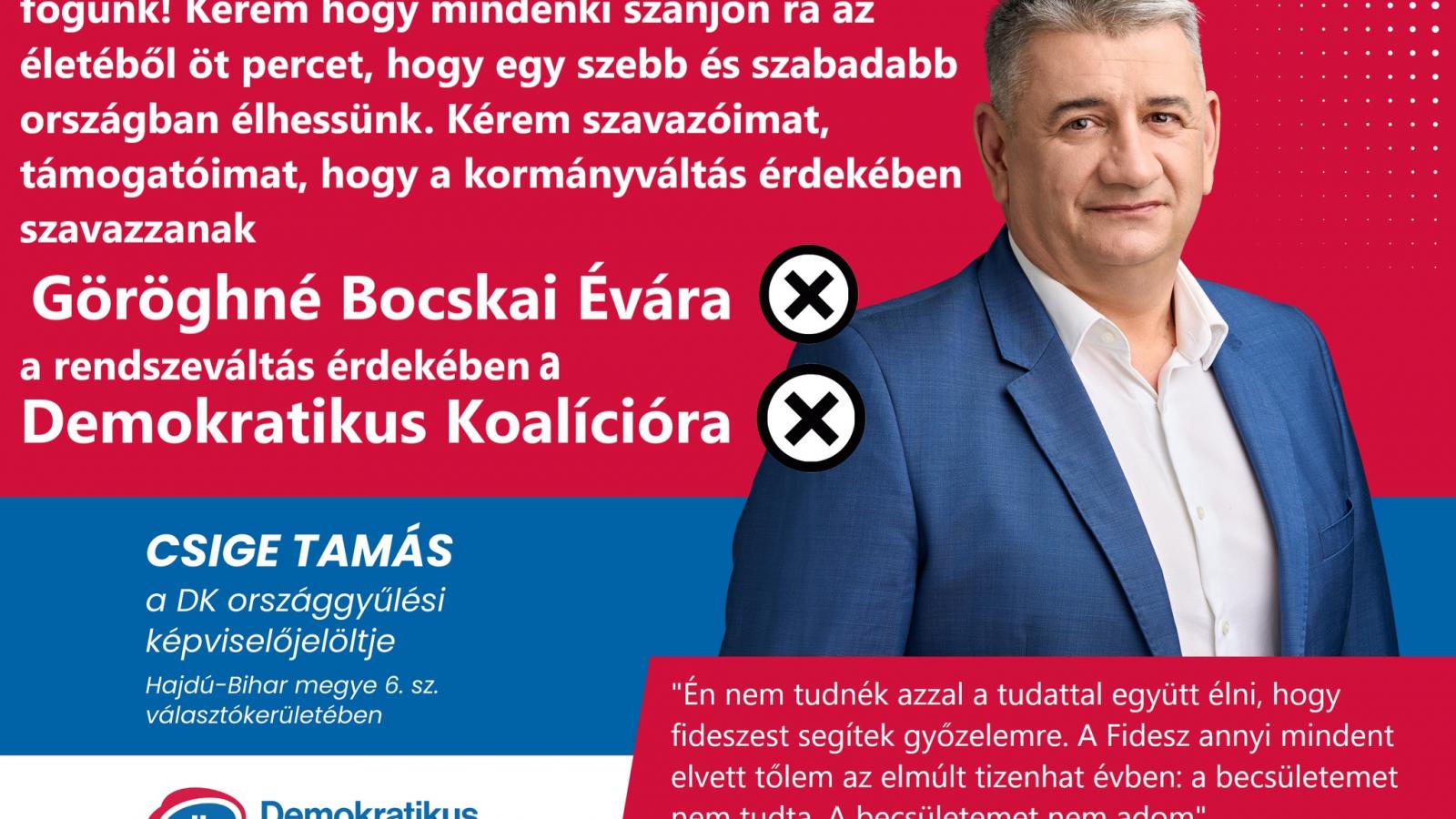 A DK hajdú-bihari választókerületi jelöltje arra kéri szavazóit, hogy egyéniben a tiszás jelöltet támogassák