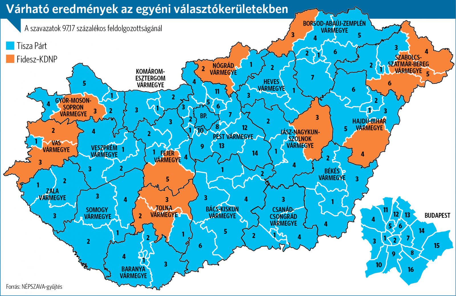 Elemzők szerint a 2026-os parlamenti választáson győztes Tisza Pártnak a külképviseleteken leadott, illetve az átjelentkezéssel leadott szavazatok akár még több mandátumot is hozhatnak, de most a jelenlegi állás alapján megpróbáltuk összegyűjteni a 106 választókerületből a legérdekesebbeket. Az új Országgyűlés 138 tiszás képviselője 93 egyéni választókerületben nyert, mint Petőfi Sándor versében a kelet-magyarországi folyónk, amikor kiáradt. Csak emlékeztetőül, Orbán Viktor leköszönő miniszterelnök a tavaly nyári tusnádürdői beszédében még 80 egyéni képviselői helyet jósolt, a Fidesznek. Az elmúlt hónapokban az ismertté vált közvélemény-kutatások alapján ezt a számot levitte 65-re , de arra talán ő sem gondolt, hogy végül a korrigált becslése töredékével is be kell érnie.