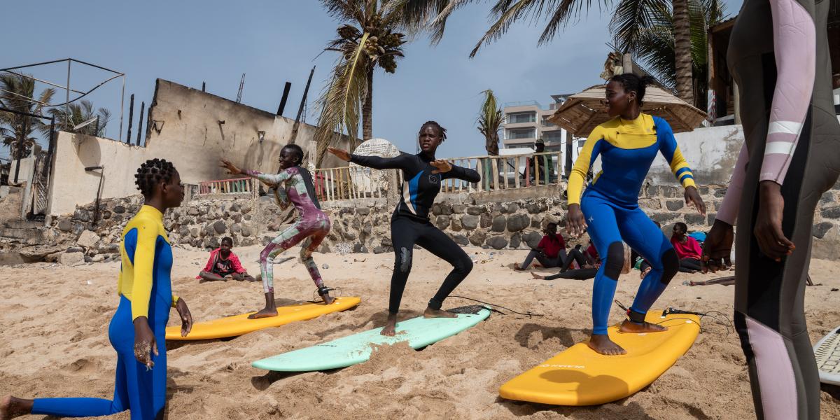 Dakar partjainál fiatal szenegáli lányok tanulnak szörfözni az AFP fotóriporterének képein.